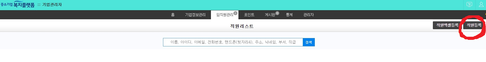 임직원 관리에서 직원 등록을 해야지만 내 회사를 위해 고생하는 임직원들이 복지몰 이용이 가능합니다!