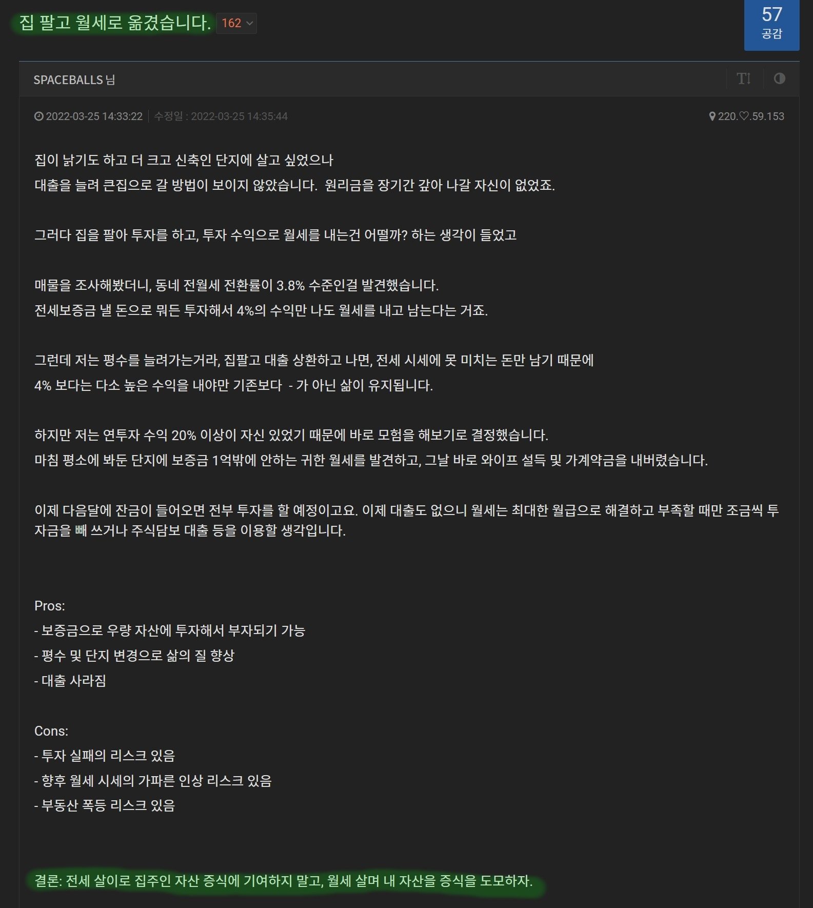 "전세살이로 집주인 자산 증식에 기여하지 말고, 월세 살며 내 자산을 증식을 도모하자"