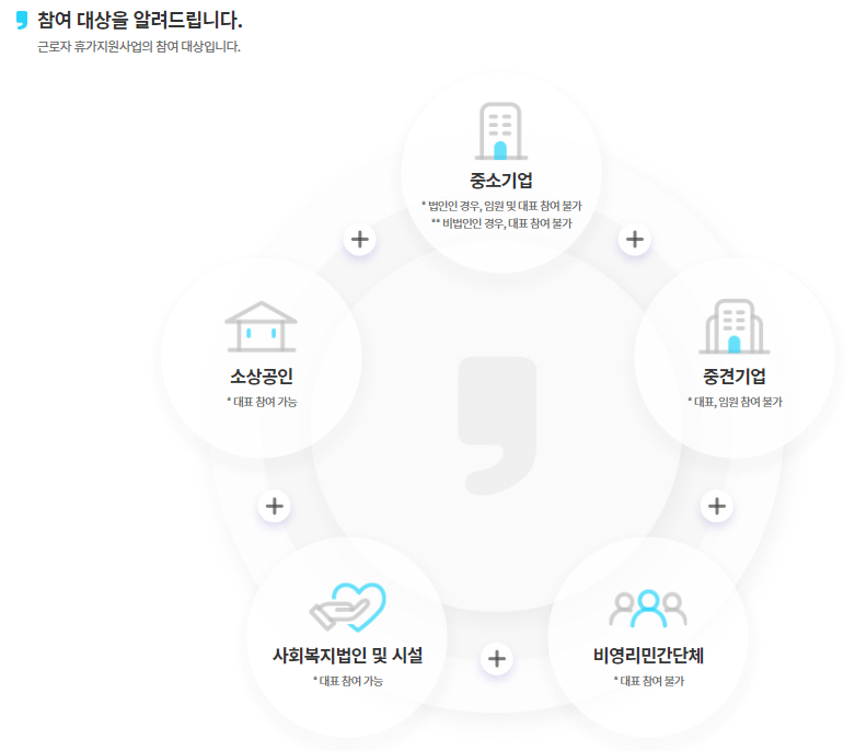 <!-- --> 참여 대상을 알려드립니다. 근로자 휴가지원사업의 참여 대상입니다. --> 아이콘 중소기업* 법인인 경우, 임원 및 대표 참여 불가** 비법인인 경우, 대표 참여 불가 중소기업* 법인인 경우,